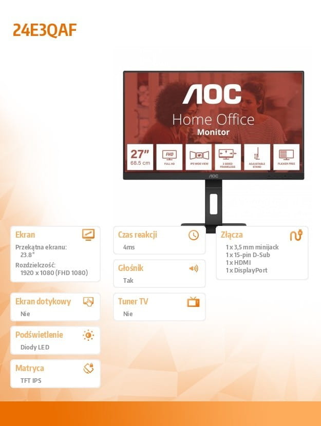 AOC Monitor 24E3QAF 23.8 cali IPS HDMI DP Pivot Głośniki