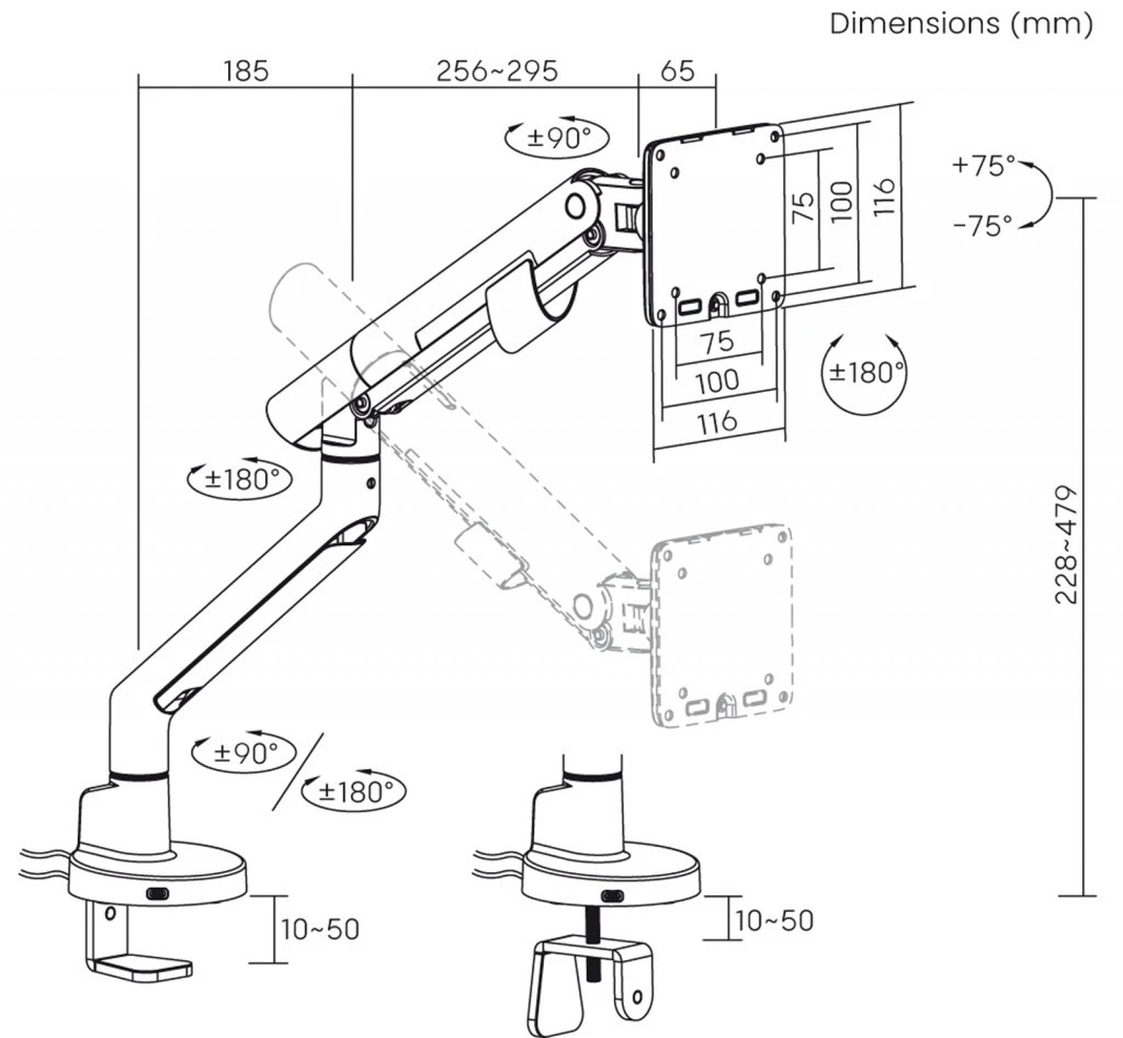 - regulacja w pionie (nachył): -75 do 75 stopni