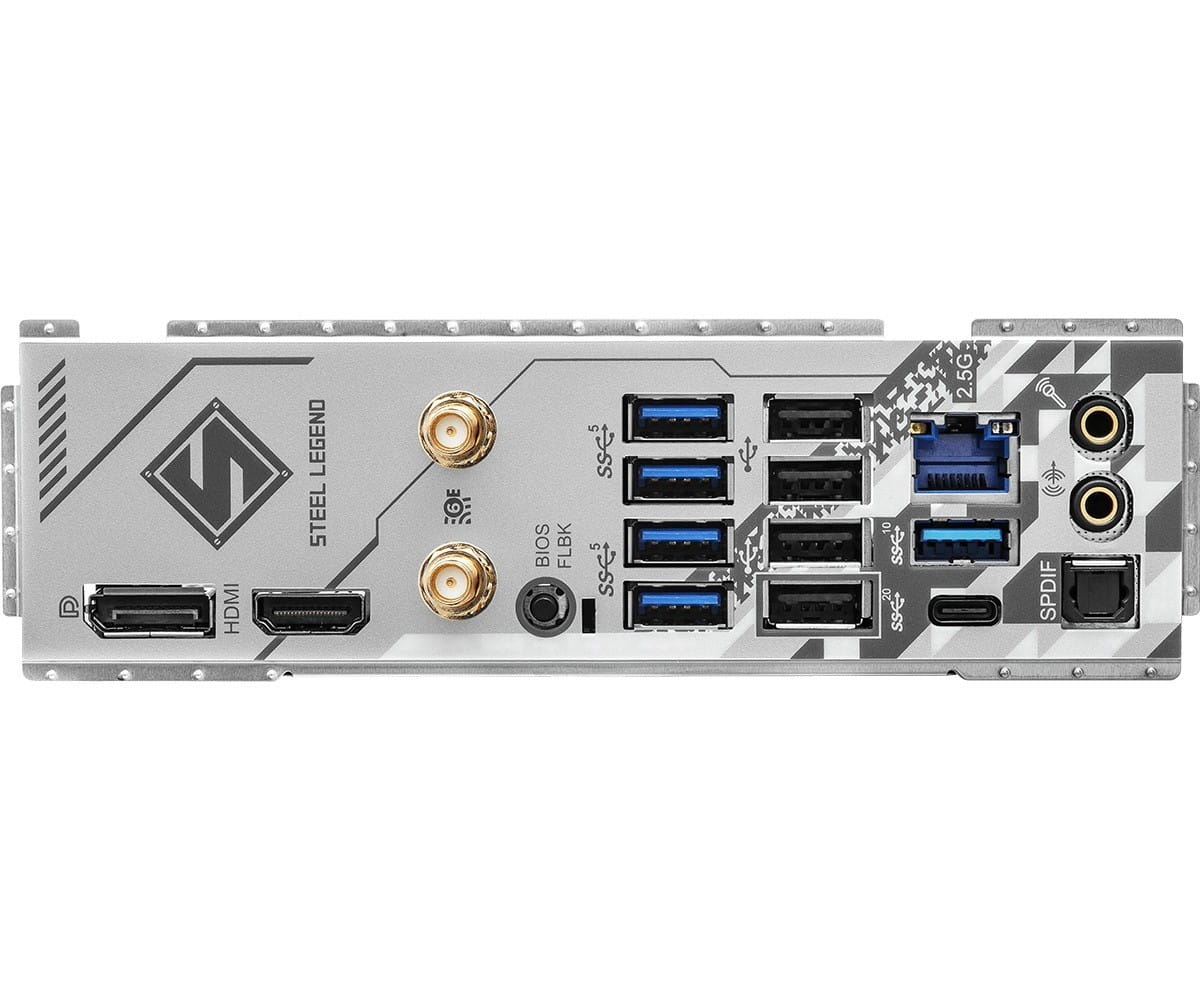 Złącza zewnętrzne: 1 x DisplayPort, 1 x HDMI, 1 x MIC (przód), 1 x RJ-45, 1 x S/PDIF, 4 x USB 2.0, 4 x USB 3.0, 1 x USB 3.2 Gen 2 Type-A, 2 x SMA, 1 x Przycisk BIOS Flash, 1 x USB 3.2 Gen 2 Type-C