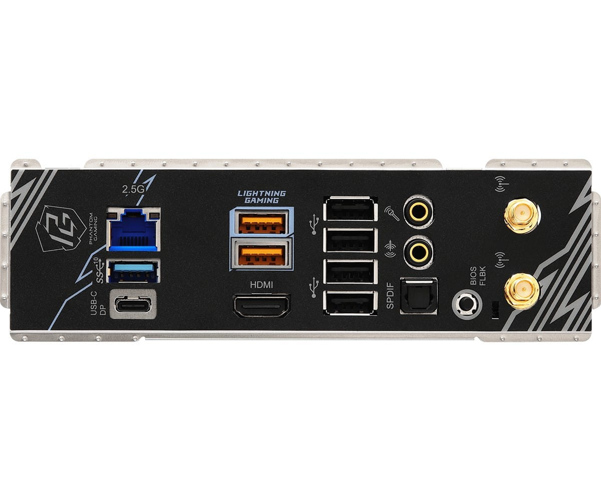 Złącza zewnętrzne: 2 x SMA, 1 x HDMI, 1 x Line Out, 1 x MIC, 1 x RJ-45, 1 x S/PDIF, 4 x USB 2.0, 1 x USB 3.2 Gen 1 Type-A, 2 x USB 3.2 Gen 2 Type-A, 1 x USB 3.2 Gen 2 Type-C, 1 x Przycisk BIOS Flash
