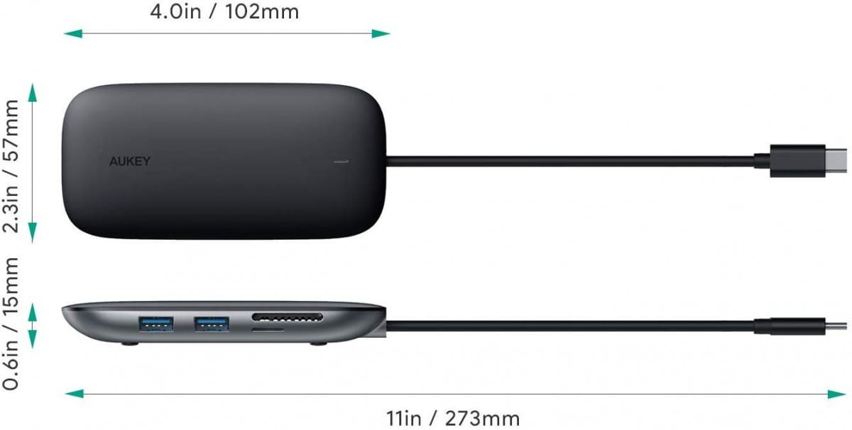 Pozostałe parametry: AUKEY CB-C71 HUB | USB 3.0 | USB-C PD | HDMI | ETHERNET Interfejsy: 3 x USB 3.1 (USB 3.0), HDMI, Ethernet, karty SD & Micro SD Podłączenie przez port: USB-C Port USB-C Power Delivery: DC 5V-20V 5A (do 100W) Prędkość transferu USB: do 5Gbps Prędkość transferu kart SD & microSD: do 5Gbps HDMI rozdzielczość: do 4K@30Hz Długość kabla: 15 cm
