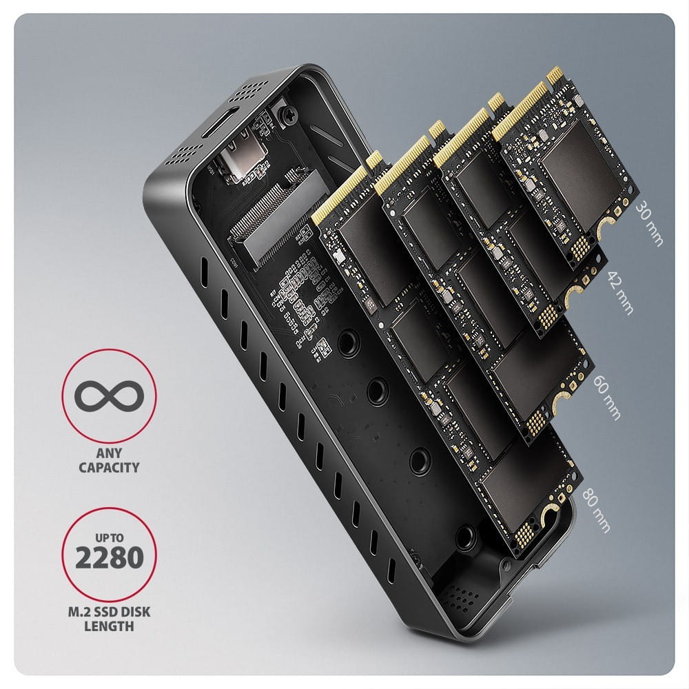 Zaleta pudełka jest zamocowania czterech różnych długości kart SSD - 30, 42, 60 i 80 mm. Disky M.2 mogą być jednostronne lub dwustronne. Boks nie ma ograniczenia dla pojemności dysków SSD. Otwieranie pudełka za pomocą tylko jednej śruby ułatwia montaż i demontaż dysku SSD M.2. Wymiana dysków jest szybka i łatwa, co rozszerza możliwości wykorzystania skrzynki, np. do migracji danych, testowania, itp.