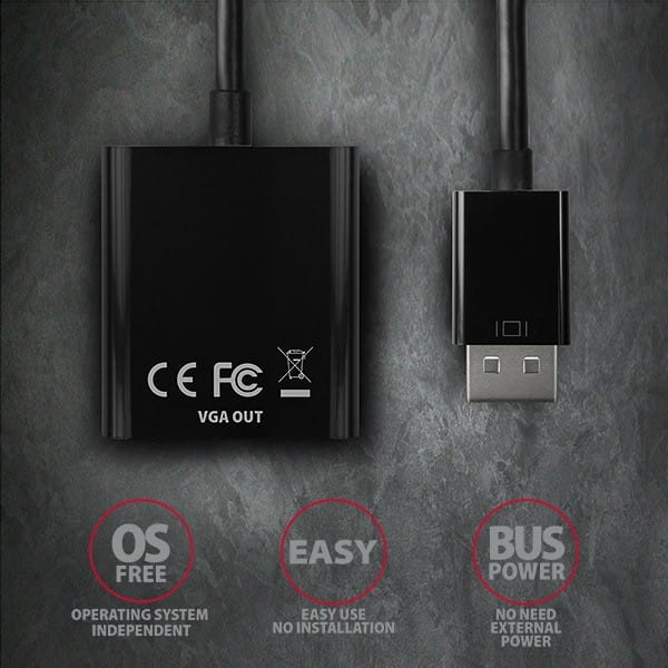 Pozostałe parametry: Wspierana rozdzielczość: max. 1920x1200 (16:10) WUXGA 1920 x 1080 (16:9) Full HD/1080p 1680 x 1050 (16:10) WSXGA+ 1600 x 1200 (4:3) UXGA 1600 x 900 (16:9) HD+ 1440 x 900 (16:10) WXGA+ 1400 x 1050 (4:3) SXGA+ 1366 x 768 (16:9) WXGA 1360 x 768 1280 x 1024 (5:4) SXGA 1280 x 960 (4:3) SXGA- 1280 x 800 (16:10) WXGA 1280 x 768 (5:3) WXGA 1280 x 720 (16:9) HD/WXGA/720p 1280 x 600 1152 x 864 (4:3) XGA+ 1024 x 768 (4:3) XGA 800 x 600 (4:3) SVGA 640 x 480 (4:3) VGA 576i/576p PAL 480i/480p NTSC Uwaga: Rozdzielczość jest zależna od parametrów monitora/TV/projektora i adaptera graficznego. Obsługiwane tryby: mirroring pulpitu monitora głównego, rozszerzenie pulpitu monitora głównego i więcej, Ładowanie z wejścia Display Port - nie wymaga zasilania zewnętrznego, Wspierane OS: Wszystkie wersje MS Windows, Mac OS X, Linux i dalsze systemy operacyjne. Chodzi o przetwornik czysto sprzętowy, przetwarzanie zapewnia jedynie chip adaptera bez współudziału komputera, żadne sterowniki nie są instalowane, kompatybilność nie jest więc zależna od wykorzystywanego systemu operacyjnego.