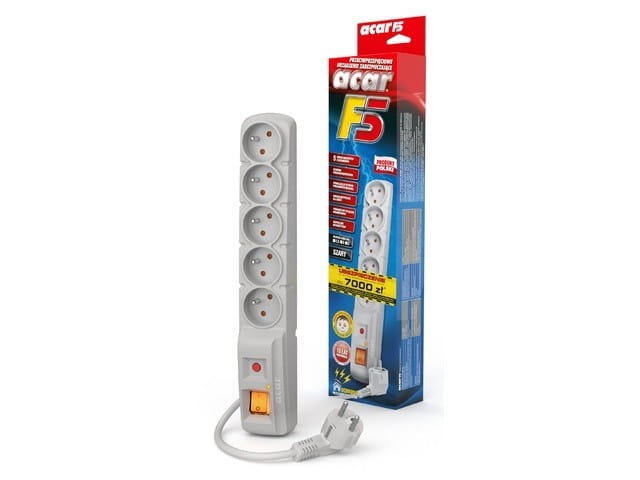 Acar F5 to zabezpieczenie przeciwprzepięciowe pięciu urządzeń. Podświetlany wyłącznik, wygodny automatyczny bezpiecznik, cztery możliwe kierunki ułożenia sznura sieciowego, estetyczne wzornictwo, konstrukcja z wysokiej jakości niepalnego tworzywa, szybkie warystory, a także 10 letnia gwarancja oraz niska cena gwarantują najbardziej trafny wybór do biura i domu.
