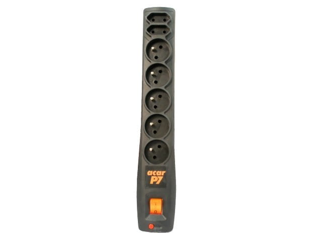 P7 to zabezpieczenie przeciwprzepięciowe aż siedmiu urządzeń. Pięć gniazd z bolcem i dodatkowo dwa gniazda płaskie. Podświetlany wyłącznik, wygodny, automatyczny bezpiecznik. Cztery możliwe kierunki ułożenia sznura sieciowego, jako system porządkowania przewodów to koniec plątaniny kabli.