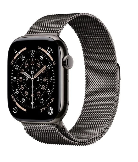 Pozostałe parametry: Czujniki Czujnik pracy serca wykorzystujący impulsy elektryczne Optyczny czujnik tętna trzeciej generacji Czujnik natlenienia krwi Czujnik temperatury Kompas Stale aktywny wysokościomierz Akcelerometr dużych przyspieszeń Żyroskop z szerokim zakresem dynamicznym Czujnik światła otoczenia Głębokościomierz do 6 m Czujnik temperatury wody Wyświetlacz Niegasnący wyświetlacz Retina OLED LTPO3 o szerokim kącie widzenia Przednie szkło IonX zapewniające 2x większą odporność na zarysowania (koperty z aluminium)8 Szkło szafirowe z przodu (koperty z tytanu) Nawet 2000 nitów jasności szczytowej Jasność minimalna 1 nit 326 pikseli na cal