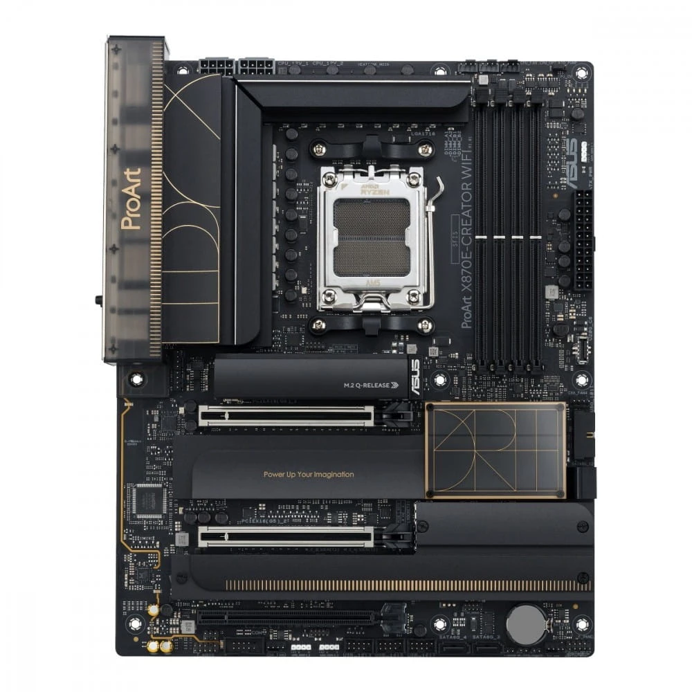 Płyta główna ProArt X870E-Creator WiFi daje twórcom na każdym poziomie maksymalizację wydajności najnowszych procesorów AMD Ryzen serii 9000, 8000 i 7000 z 16+2+2 zespołami mocy, gniazdami DDR5, PCIe 5.0 i błyskawiczną łącznością, w tym podwójnym USB4, 10G i 2.5G Ethernet oraz WiFi 7.