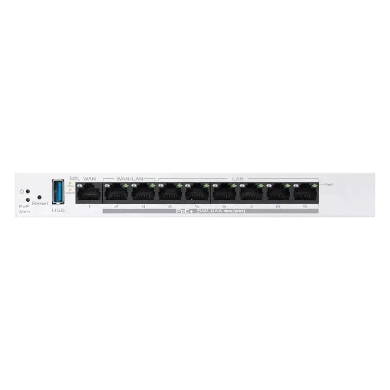 Porty we/wy: 1 x 10/100/1000 Mbit/s LAN / WAN (Combo), 2 x 10/100/1000 Mbit/s LAN / WAN (Combo), 8 x 10/100/1000 Mbit/s PoE, 1 x WAN (RJ-45), 1 x USB 3.0