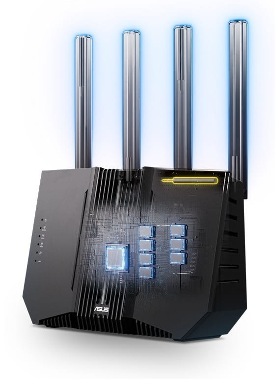 Trójzakresowy router BE9700 Wi-Fi 7, obsługa nowego kanału 320 MHz i technologii 4096-QAM, Multi-link Operation (MLO), wykrywanie sieci WAN z AI, obsługa AiMesh, pakiet zabezpieczeń sieciowych dostępny bez subskrypcji i kompleksowe funkcje VPN, Smart Home Master
