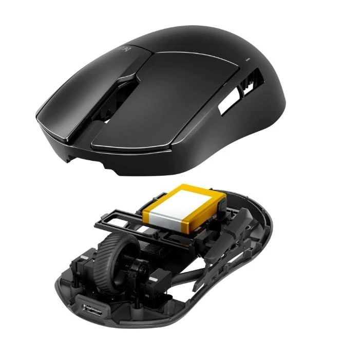 - Na spodzie myszy znajduje się również przełącznik do zmiany między 5 konfigurowalnymi poziomami DPI oraz suwak umożliwiający włączenie lub wyłączenie urządzenia w celu oszczędzania baterii.