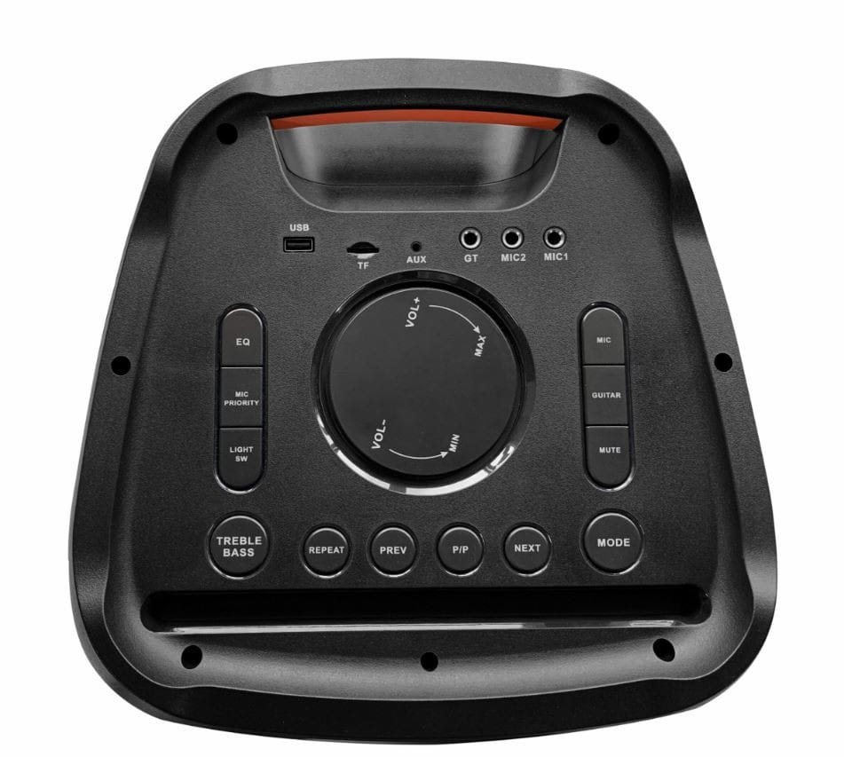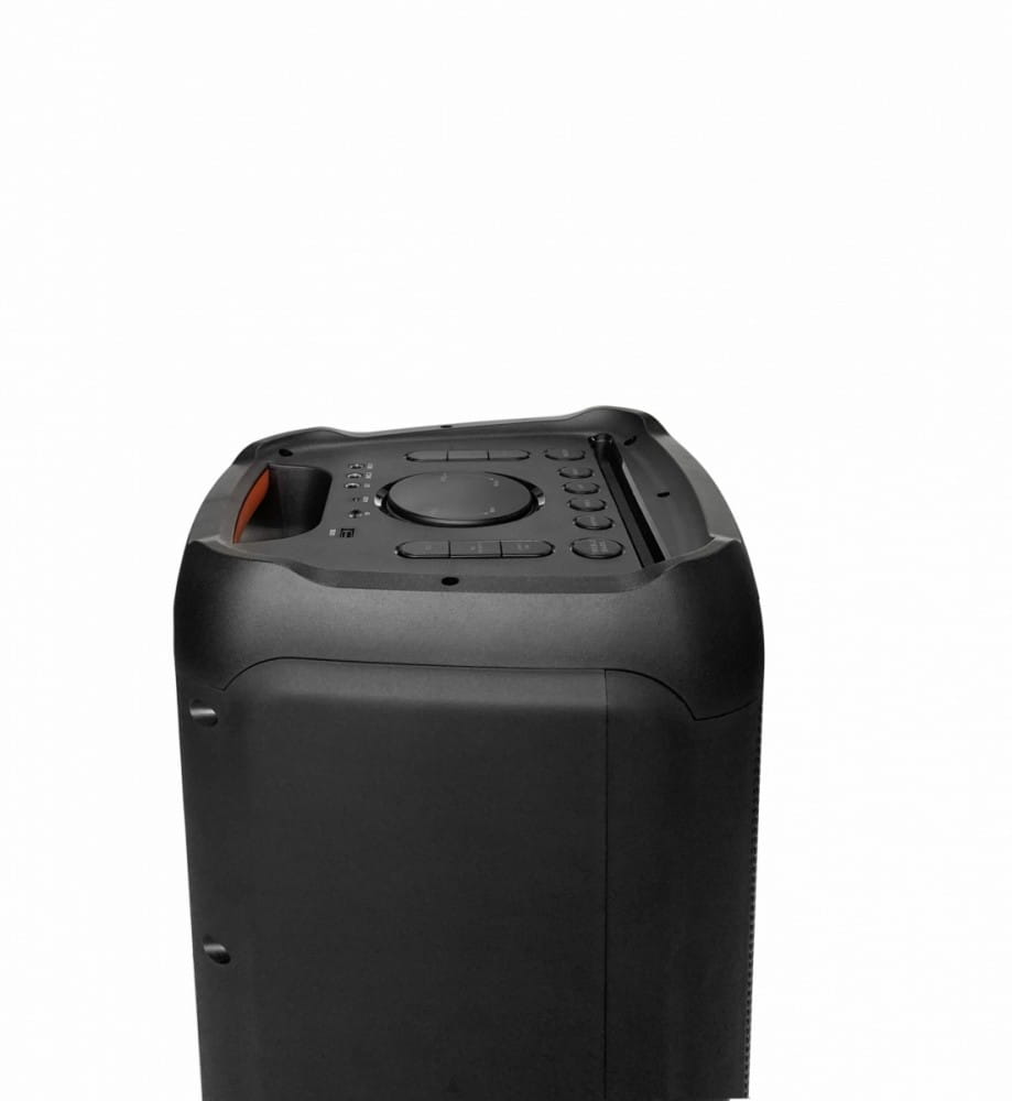 Pozostałe parametry: Bluetooth do odtwarzania muzyki poprzez profil audiostreaming (A2DP) Funkcja bezprzewodowego stereo (TWS) Odtwarzacz USB/microSD Odtwarzanie plików MP3 Radio FM z pamięcią 40 stacji Regulacja basów i sopranów Funkcja karaoke z dwoma mikrofonami bezprzewodowymi w zestawie Wejście AUX, Gitara, 2 x mikrofon przewodowy Wyświetlacz LED Kolorowe oświetlenie Disco LED Zasilanie sieciowe: AC 110-240 V~50/60 Hz Zasilanie bateryjne: wbudowany akumulator 12 V/ 9 Ah