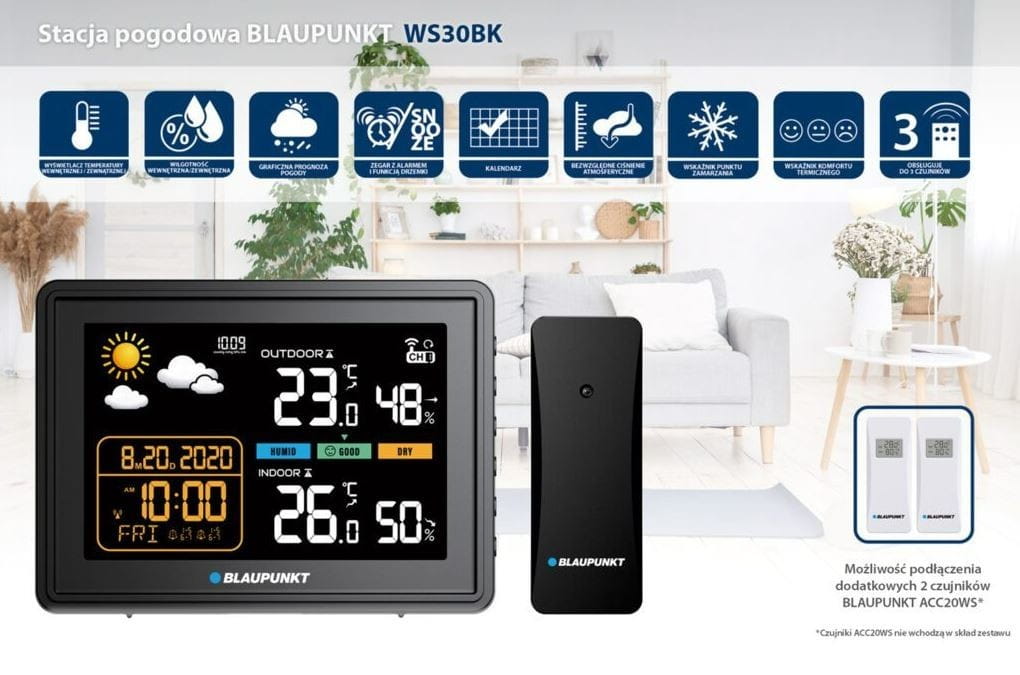 Nie ma problemu. Stacja obsługuje do trzech czujników zewnętrznych, tak więc do dołączonego do zestawu sensora, możesz dokupić dodatkowe dwa opcjonalne czujniki Blaupunkt ACC20WS, ustawić je na odpowiednich kanałach (czujniki posiadają 3 kanały, przełączane manualnie), tak aby sygnały wzajemnie się nie zakłócały i zaaplikować je gdzie tylko chcesz. Potrzebujesz monitorować temperaturę i wilgotność w sypialni, garażu lub przydomowej spiżarni nic prostszego, pozostaw tam czujnik, a wartości pomiarów odczytasz na ekranie stacji pogodowej WS30BK. Dzięki wbudowanym w opcjonalne czujniki ACC20WS wyświetlaczom LCD wartość temperatury i wilgotności sprawdzisz też tam, gdzie je postawisz.
