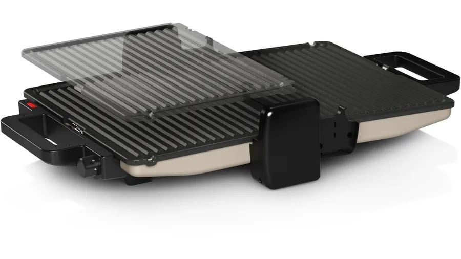 - Szeroki zakres możliwości dzięki trzem pozycjom grillowania: jako grill kontaktowy (pozycja zamknięta), jako grill stołowy (pozycja otwarta) lub z górnym i dolnym grzaniem (pozycja pół-otwarta).