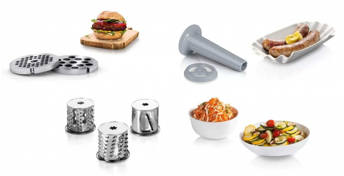 Akcesoria w zestawie: Sitka o średnicy oczek: 3,8 / 8 mm Nasadka masarska Szatkownica z 3 bębnami tnącymi