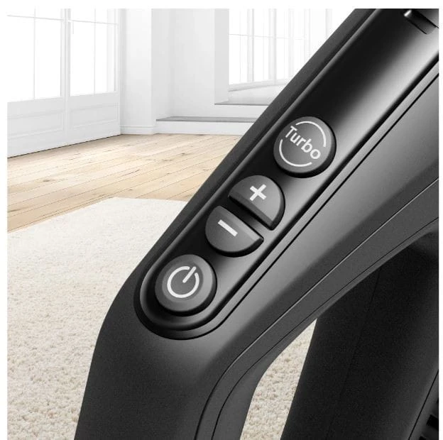 Koniec ze schylaniem się w celu regulacji mocy odkurzania. Remote Power Control umożliwia sterowanie wszystkimi ustawieniami bezpośrednio z uchwytu. Wystarczy jedno dotknięcie, aby przełączyć się w tryb turbo, tryb czuwania lub żądany poziom mocy. Teraz możesz cieszyć się najwyższą wydajnością odkurzania wszystkich rodzajów podłóg.