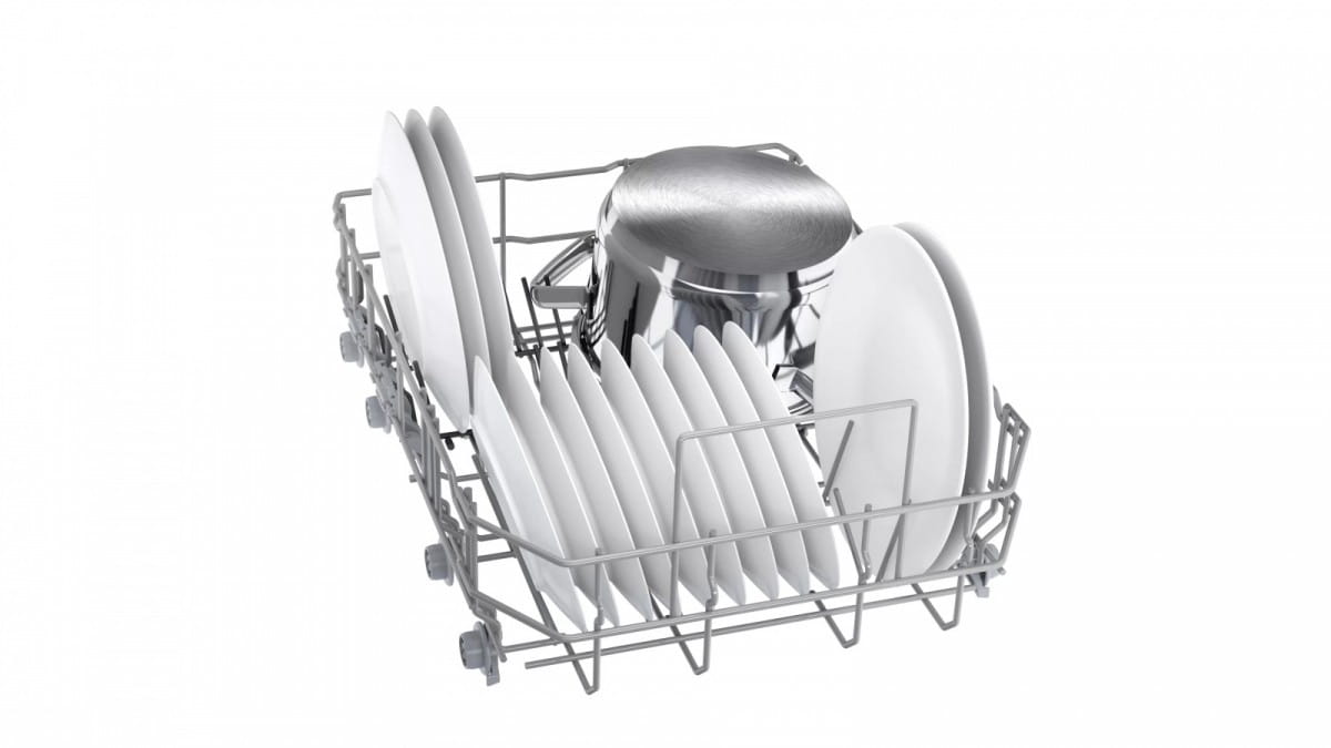 - Rackmatic: regulowana wysokość kosza zmywarki usprawnia mycie wysokich naczyń.