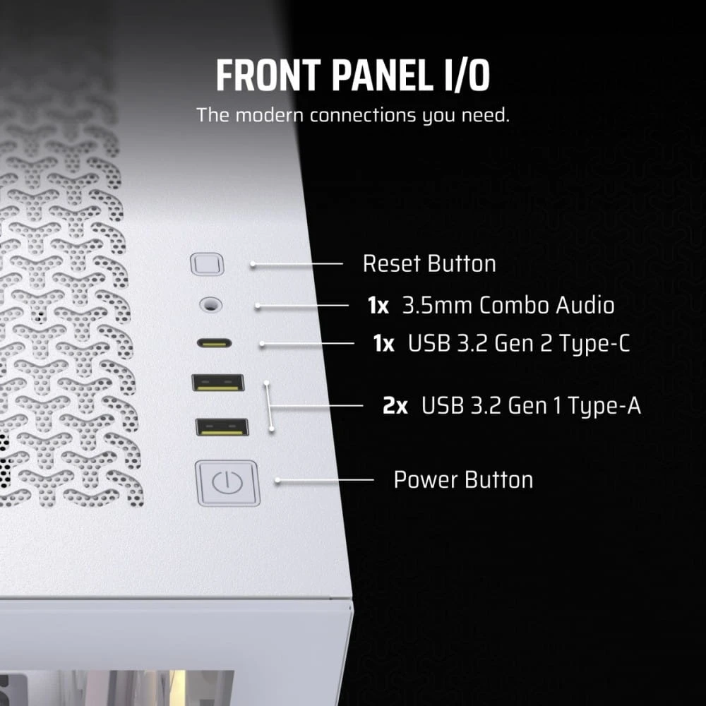 Złącza na przednim panelu: 1 x mikrofon/słuchawki (combo), Power, 2 x USB 3.0, 1 x USB 3.1 Typ C, Reset