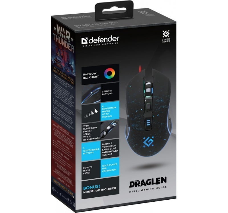 Mysz Defender GM-907 DRAGLEN 7200dpi 6P. Wygodna przewodowa mysz do gier z tęczowym podświetleniem. Model ten posiada 6 trybów rozdzielczości w zakresie od 1200 do 7200 dpi. Mysz posiada także boczne przyciski Do przodu i Do tyłu oraz teflonowe nóżki umożliwiające łatwe i szybkie przesuwanie. Do myszy dołączona jest podkładka.