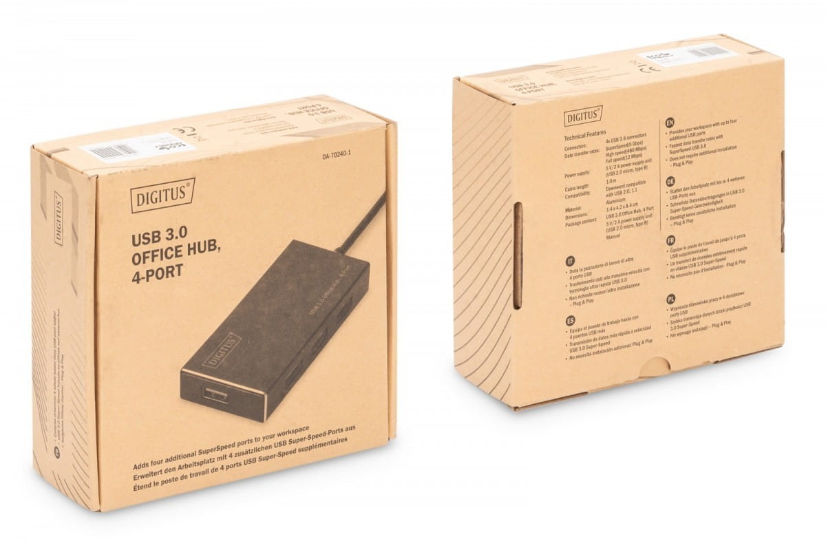 Hub DIGITUS Business USB 3.0 to idealne rozszerzenie dla każdej stacji roboczej. Maksymalnie cztery urządzenia USB mogą być podłączone i używane w tym samym czasie, co ułatwia korzystanie z wielu urządzeń wejściowych lub przenośnych urządzeń pamięci masowej. Dzięki technologii USB 3.0 transmisja danych osiąga prędkości do 5 Gbps i gwarantuje najszybszą wymianę danych. Wysokiej jakości aluminiowa obudowa huba USB 3.0 DIGITUS Business posiada subtelny i ponadczasowy design, dzięki czemu dobrze wygląda na każdym biurku.