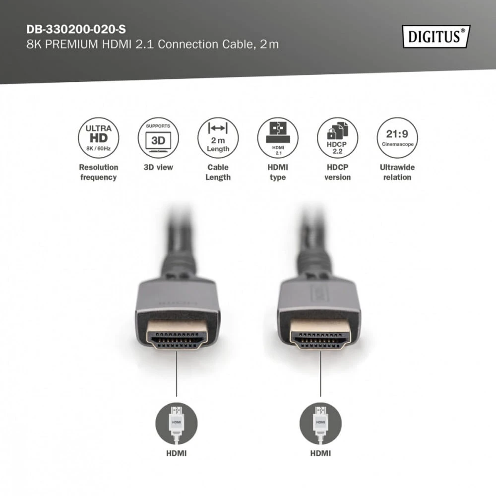 Digitus Kabel Premium połączeniowy HDMI 2.1 Ultra HighSpeed 8K60Hz UHD Typ HDMI A/A M/M 2m Czarny