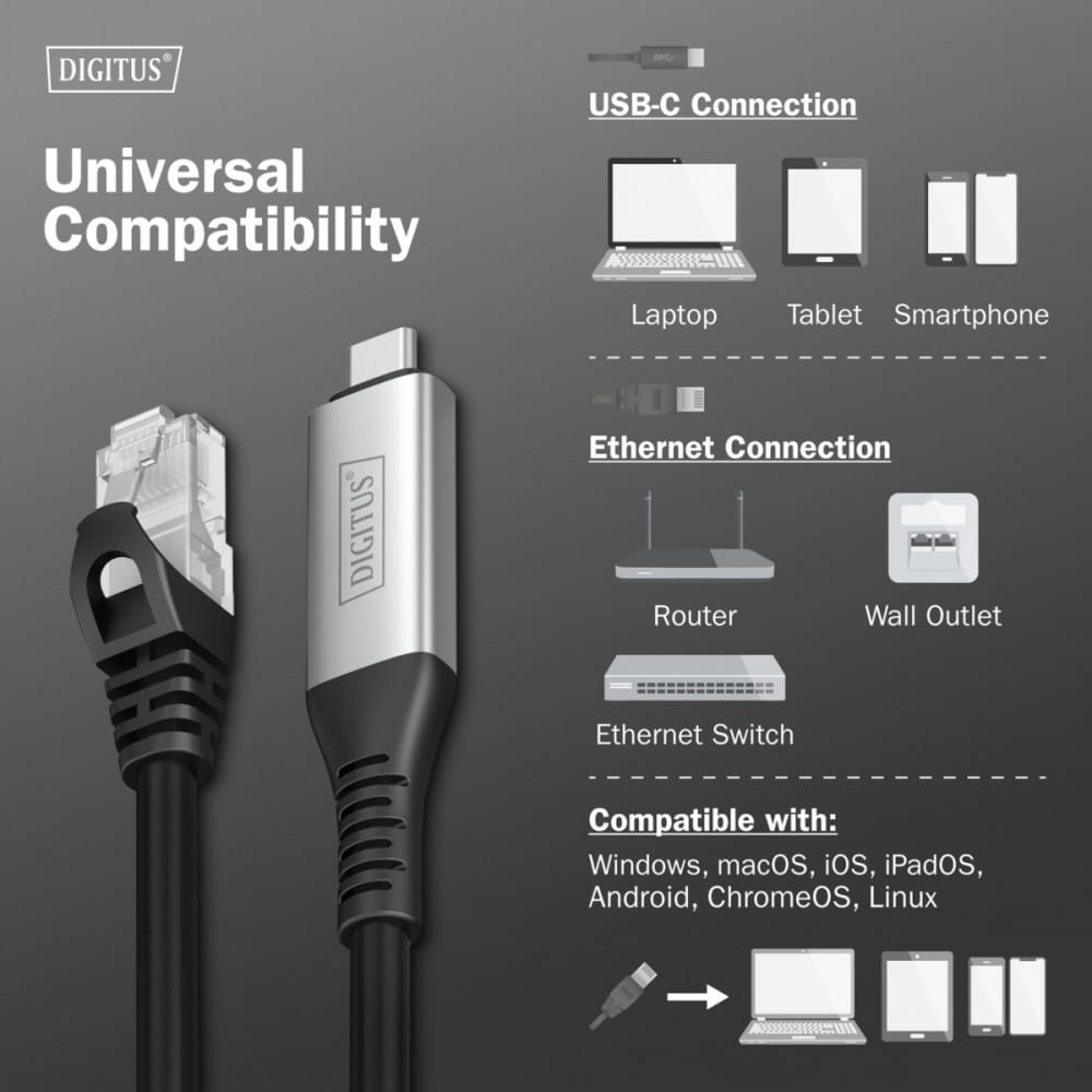 Digitus Kabel adapter USB-C - RJ45 Kat. 6A S/FTP, 1 Gbit/s, USB 3.2 Gen1, LSZH, 2m