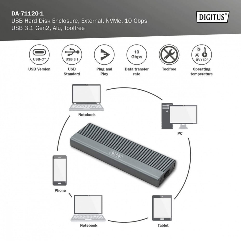 Digitus Obudowa USB 3.1 Typ C na dysk SSD M.2 NVMe 10 Gbps aluminiowa, beznarzędziowa