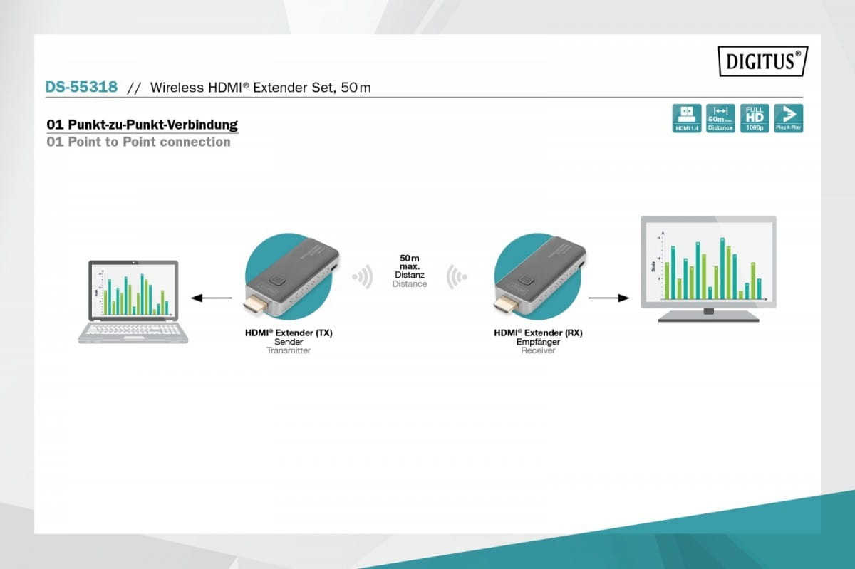 - Przesyłanie multimediów: Zestaw extendera HDMI DIGITUS, który opiera się na technologii radiowej, przesyła bezprzewodowo sygnały audio i wideo w jakości full HD (1080p/60 Hz)
