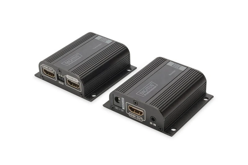 Zestaw przedłużacza Digitus HDMI, Full HD to rozwiązanie do przedłużania sygnału wideo do 50 m spełniające najwyższe wymagania. Przesyła cyfrowe sygnały wideo i audio na maksymalną długość do 50 m. Najwyższa obsługiwana rozdzielczość wideo to 1080p/60Hz. Na jednostce nadajnika znajduje się przełącznik EDID-Switch, dzięki któremu można regulować rozdzielczość oraz format audio sygnału wyjściowego. Na nadajniku znajduje się również port HDMI Loop Out, który umożliwia podłączenie lokalnego monitora. Dzięki obsłudze kabla PoC (power over cable) jednostka nadajnika musi jednak posiadać zasilanie elektryczne. W zestawie znajdują się dwa dwukierunkowe moduły na podczerwień (nadajnik, odbiornik), poprzez które można za pomocą pilota zdalnie sterować podłączonym źródłem sygnału wejściowego.