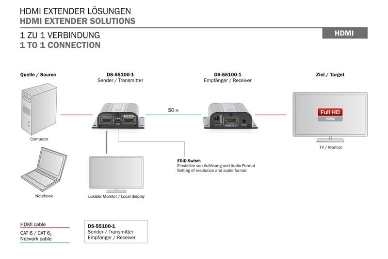 Zestaw przedłużacza HDMI, 50 m przez kabel sieciowy (CAT 6/6a/7), EDID, 1x HDMI Loop Out, FHD 1080p