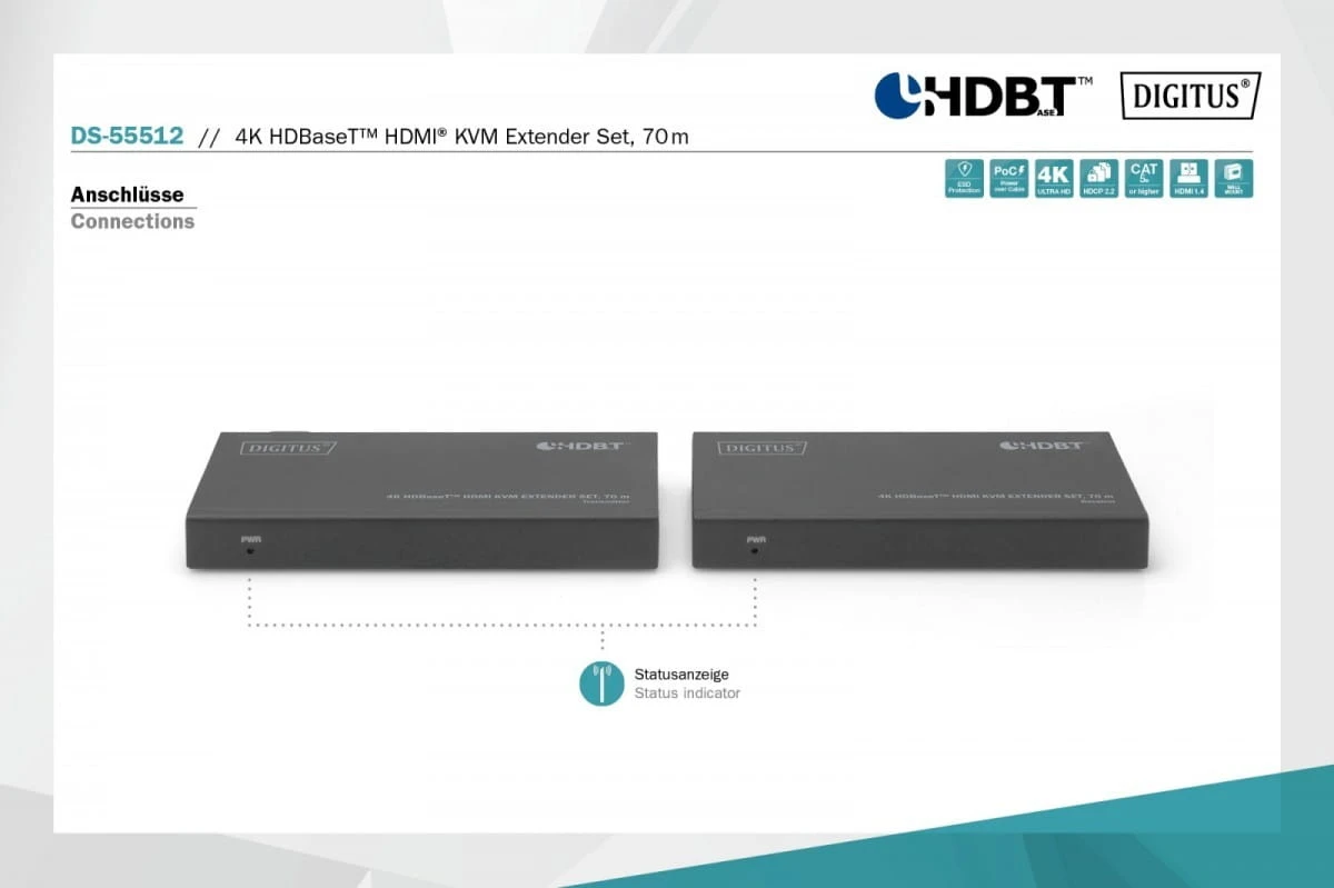 Zestaw HDBaseT HDMI KVM Extender umożliwia transmisję sygnału na duże odległości za pomocą zwykłego przewodu z drutu miedzianego do przesyłu danych. Maksymalny zasięg transmisji wynosi 70 m (Full HD). Sygnały w rozdzielczości 4K można przedłużać na odległość do 40 m. Dzięki technologii PoC tylko jedna jednostka musi być podłączona do prądu za pomocą zewnętrznego zasilacza. Dwukierunkowa transmisja sygnału podczerwieni oraz funkcjonalność KVM (USB 1.1) do podłączania myszy i klawiatury również należą do funkcji tego rozwiązania.