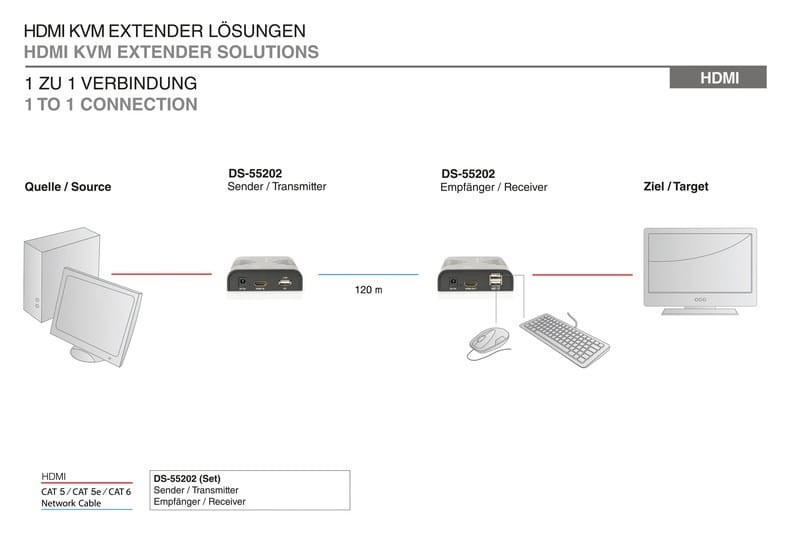 Zestaw przedłużacza sygnału wideo HDMI KVM marki Digitus składa się z nadajnika (lokalizacja na miejscu) oraz odbiornika (lokalizacja w innym, oddalonym miejscu). Sygnał HDMI można przedłużyć przez kabel sieciowy (CAT 6, 5e, 5) na maksymalną odległość 120 m. Sygnał HDMI można również przedłużyć na nieograniczony dystans poprzez istniejącą infrastrukturę sieciową (poprzez połączenie IP). Najwyższa obsługiwana rozdzielczość wideo to 1080p/60 Hz. Umożliwia również wygodny dostęp do komputera (mysz & klawiatura) poprzez porty USB na odbiorniku. Nadaje się idealnie do zastosowań przemysłowych, handlowych oraz publicznych.