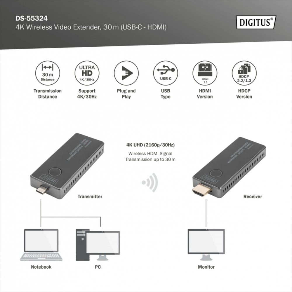 Przesyła bezprzewodowo sygnały wideo i audio w UHD 4K / 30 Hz na odległość do 30 m (przy braku przeszkód w linii prostej).