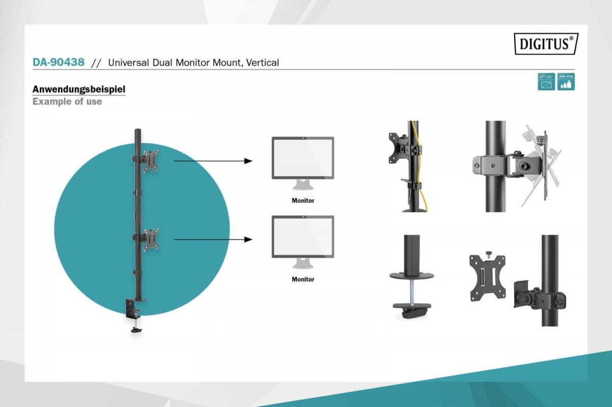 Akcesoria w zestawie: 1 x uniwersalny podwójny uchwyt na monitor, ustawienie pionowe 1 x materiały montażowe 1 x instrukcja montażu