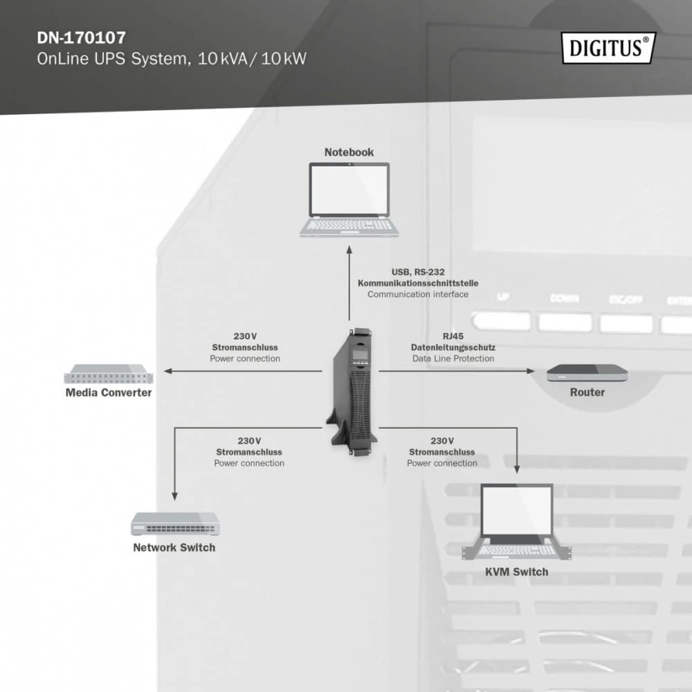 Digitus Zasilacz awaryjny UPS Online Rack 19"/Tower, 10kVA/10kW, 2U, bez baterii (moduł baterii DN-170108)