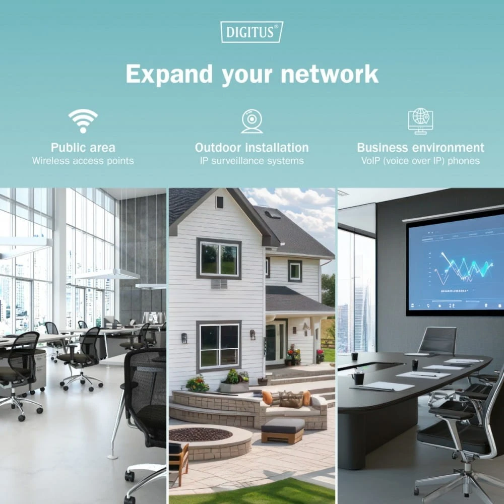 - Kompatybilność: Obsługuje standardy IEEE802.3af/at, idealny dla wszystkich kompatybilnych urządzeń PoE