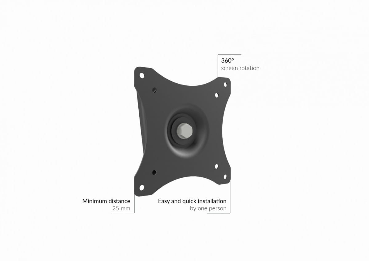 Klasyczny, uniwersalny uchwyt ścienny do małych ekranów. Jego prosta konstrukcja sprawia, że jest szybki i łatwy w montażu na ścianach o rożnej strukturze. Możliwość obrotu o 360° i minimalna odległość od ściany 25 mm czynią go niezwykle funkcjonalnym. GD03 zajmuje małą powierzchnię oraz posiada możliwość ustawienia ekranu w pionie lub poziomie. Nowoczesny design i wysokiej jakości wykończenie spełnią oczekiwania najbardziej wymagających klientów. GD03 to uchwyt idealny do montażu ekranu w pokoju hotelowym czy niewielkiej poczekalni.
