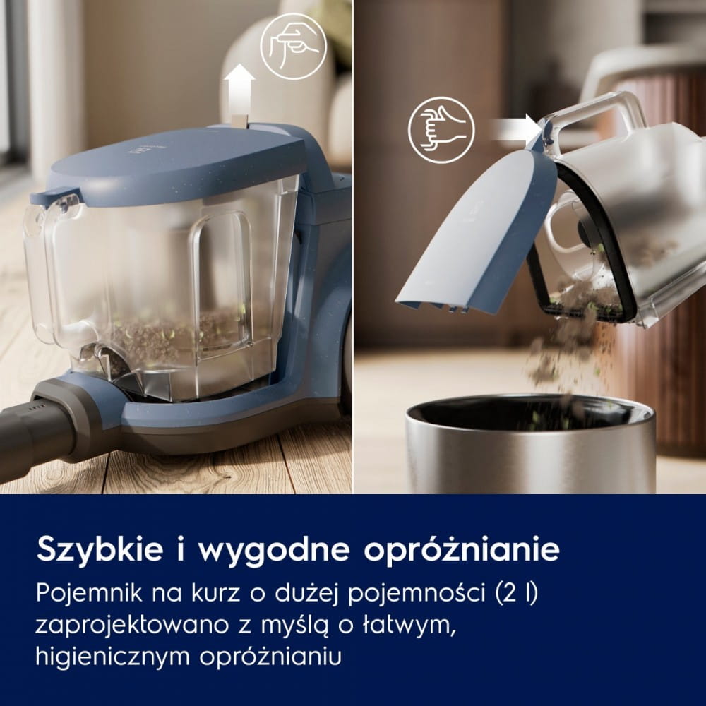 Najmniej higieniczna czynność w ramach odkurzania staje się w ten sposób czystsza i łatwiejsza. Wystarczy jedną ręką opróżnić pojemnik, który został zaprojektowany do bezproblemowego pozbywania się odpadów i minimalnego kontaktu z kurzem od początku do końca.