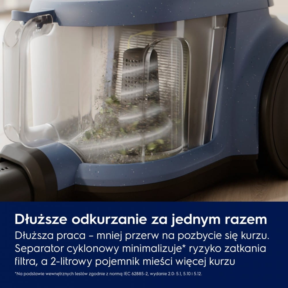*Na podstawie wewnętrznych testów filtracji mikrocząstek kurzu o wielkości 0,310 mikronów zgodnie z normą IEC 62885-2:2021, 5.14 z użyciem standardowych cząstek piasku/kurzu.