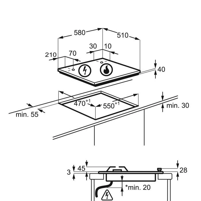 Informacje o płycie: Moc/średnica - pole prawe przednie: 1000 W/54 mm Moc/średnica - pole prawe tylne: 1850 W/70 mm Moc/średnica - pole lewe przednie: 2950 W/100 mm Moc/średnica - pole lewe tylne: 1850 W/70 mm