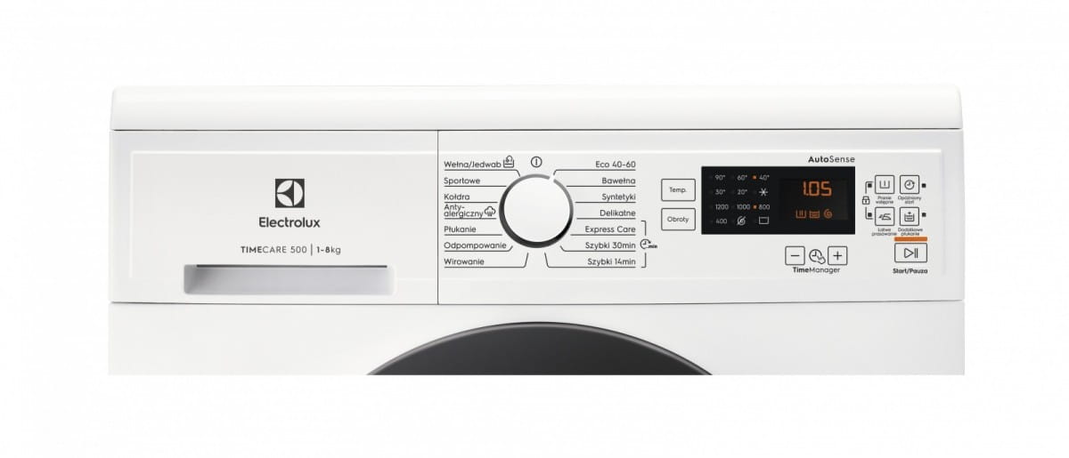 Programy i opcje prania: Wirowanie, Wełna, Antyalergiczny, Sport, Pranie wstępne, TimeManager, Płukanie dodatkowe, Kołdry, Łatwe prasowanie/para, Odpompowanie, Opóźniony start, Płukanie, Express Care, Jedwab, Bawełna/EcoBawełna, Delikatny, Eco 40-60, Syntetyki, Szybki 14', Szybki 30'
