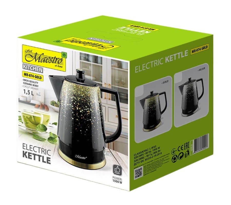Ceramiczny czajnik elektryczny Maestro MR-074-GOLD to eleganckie i funkcjonalne urządzenie o pojemności 1,5 litra, które idealnie sprawdzi się w każdej kuchni. Z mocą 1500 W czajnik szybko zagotowuje wodę, zapewniając wygodę codziennego użytkowania. Obudowa wykonana jest z wysokiej jakości ceramiki, co nadaje mu nowoczesny wygląd oraz trwałość.