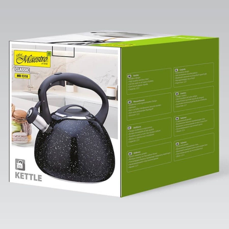 Czajnik nieelektryczny Maestro MR-1310 to funkcjonalne urządzenie z gwizdkiem, które sprawdzi się w każdej kuchni. Wykonany z wysokiej jakości stali nierdzewnej, cechuje się solidnością oraz eleganckim wyglądem. Pojemność czajnika wynosi 2,5 litra, co umożliwia jednorazowe zagotowanie ilości wody, idealnej na herbatę lub kawę dla całej rodziny.