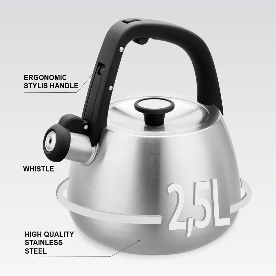 Czajnik nieelektryczny Maestro MR-1318 to funkcjonalne urządzenie z gwizdkiem, które sprawdzi się w każdej kuchni. Wykonany z wysokiej jakości stali nierdzewnej, cechuje się solidnością oraz eleganckim wyglądem. Pojemność czajnika wynosi 2,5 litra, co umożliwia jednorazowe zagotowanie ilości wody, idealnej na herbatę lub kawę dla całej rodziny.