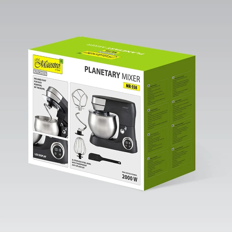 Robot planetarny Maestro MR-558 to zaawansowany robot kuchenny, idealny do intensywnych prac kulinarnych. Wyposażony w imponującą maksymalną moc 2000 W (nominalna moc 1300 W), zapewnia wysoką wydajność podczas mieszania, zagniatania i ubijania składników. Zasilany napięciem 220-240 V, urządzenie posiada dużą, 5-litrową misę wykonaną ze szczotkowanej stali nierdzewnej, co czyni go odpowiednim do przygotowywania większych porcji.