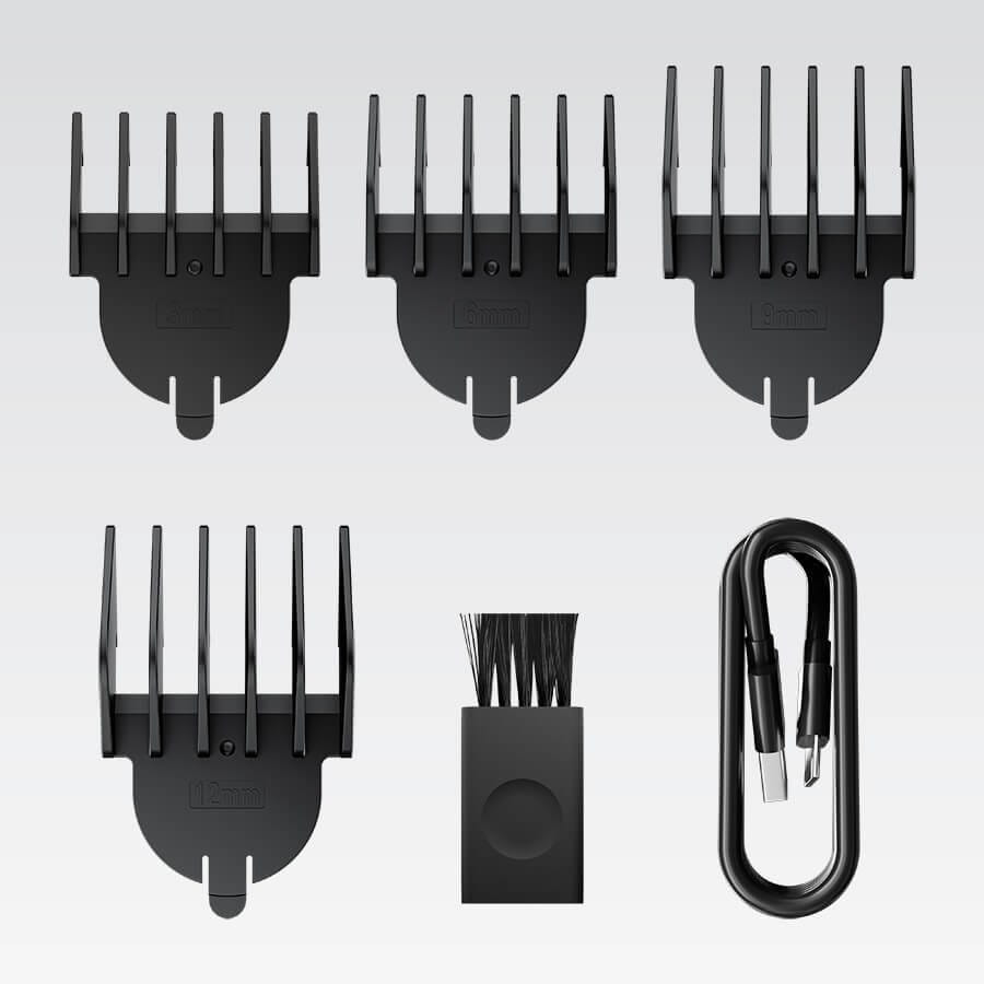 Akcesoria w zestawie: Kabel USB C do ładowania Szczoteczka do czyszczenia ostrzy Oliwa do pielęgnacji ostrzy 4 nasadki grzebieniowe (3, 6, 9, 12 mm) Grzebień Podstawka do przechowywania 6 wymiennych głowic trymer do włosów; trymer do uszu/nosa; trymer do ciała mni golarka trymer do stylizacji brody trymer precyzyjny