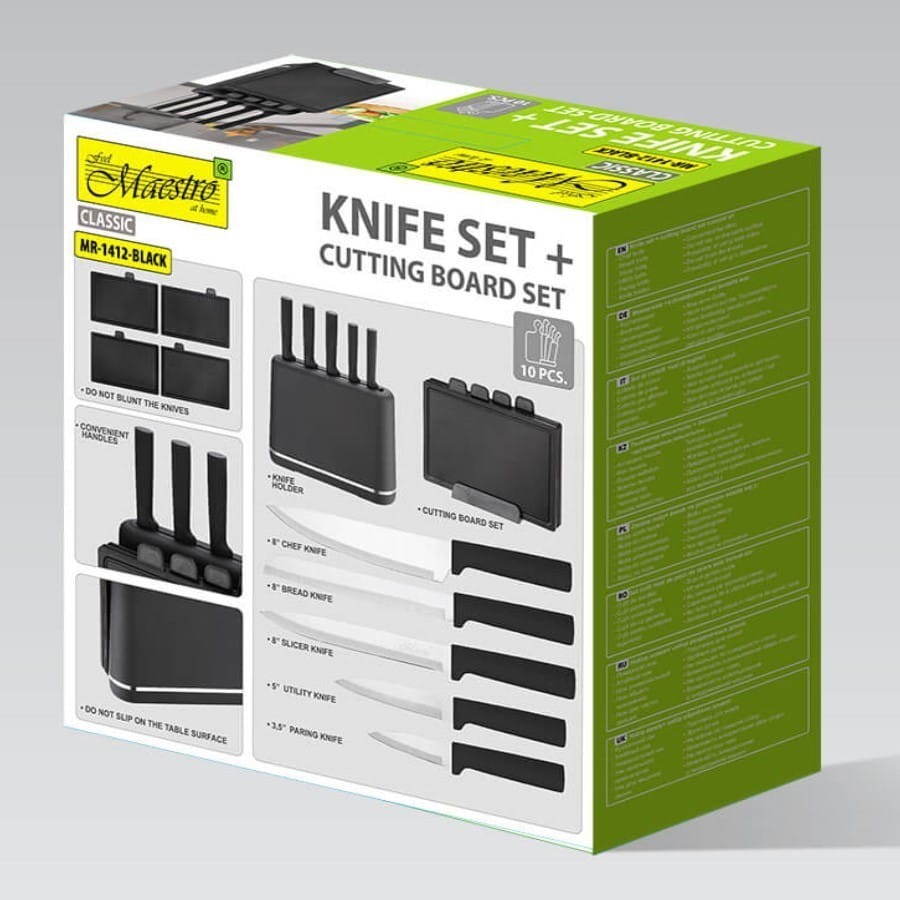 - Zestaw noży + desek na podstawce Maestro MR-1412-BLACK to komplet 10 elementów do kuchni, który łączy funkcjonalność noży z praktycznym zestawem desek do krojenia.