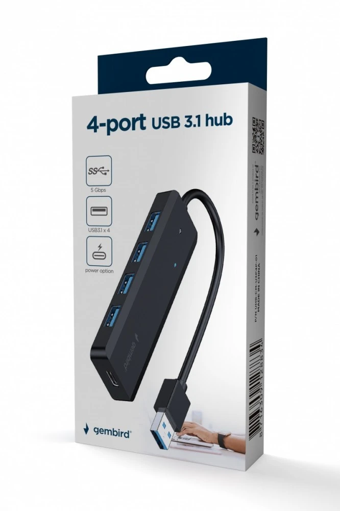 Gembird HUB 4-portowy USB 3.1 (Gen 1), z opcją zasilania zewnętrznego przez port USB-C
