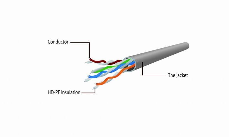 Pozostałe parametry: Pasmo częstotliwości: maksymalnie 250 MHz Zgodność ze standardami ANSI/TIA/EIA-568B Przewodnik: AWG 26 4P (drut 7 x 0,16 mm), czysta miedź Izolacja przewodu: HDPE 0,85 mm Wypełniacz LDPE Materiał izolacji: PVC Splot kurtki: brak Średnica zewnętrzna płaszcza: 6,2 mm