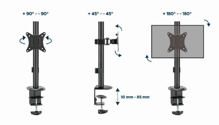 Pozostałe parametry: Zakres pochylenia: +45° ~ -45° Zakres obrotu: +90° ~ -90° Obrót ekranu: +180° ~ -180° Instalacja: Zacisk biurkowy lub przelotka Maks. grubość biurka: Zacisk: 10 ~ 85 mm, Przelotka: 10 ~ 40 mm Zarządzanie kablami