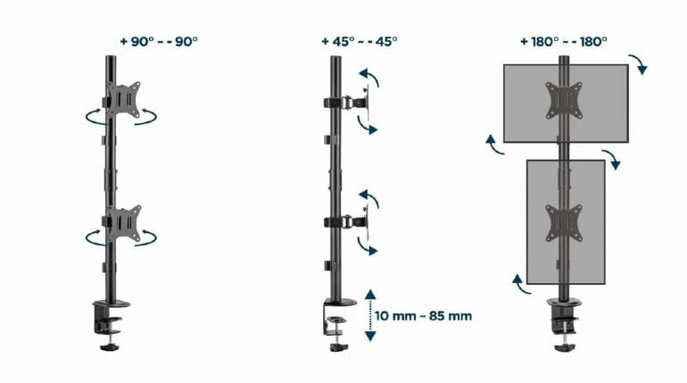 Pozostałe parametry: Zakres pochylenia: +45° ~ -45° Zakres obrotu: +90° ~ -90° Obrót ekranu: +180° ~ -180° Instalacja: zacisk, przelotka Maks. grubość biurka: Zacisk: 10 ~ 85 mm, Przelotka: 10 ~ 40 mm